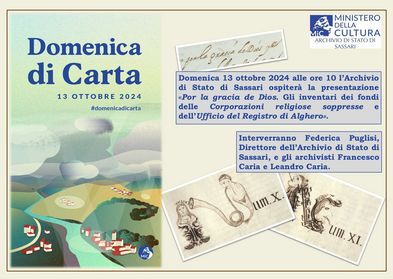 In occasione dell'apertura straordinaria per Domenica di Carta 2024, domenica 13 ottobre 2024 alle ore 10, presso la sede di via Enrico Costa 57 (ex Ospedale civile di Piazza Fiume), l’Archivio di Stato di Sassari ospiterà la presentazione «Por la gracia de Dios. Gli inventari dei fondi delle Corporazioni religiose soppresse e dell’Ufficio del Registro di Alghero», realizzati tramite l’applicativo Archimista dagli archivisti Francesco Caria e Leandro Caria nell’ambito della collaborazione volontaria svolta ai sensi dell’art. 55 del DPR 1963/1409.