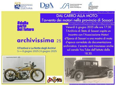 Considerato che il tema proposto per quest’anno è #Dalla parte del futuro, è organizzato un incontro dal titolo Dal carro alla moto: l’avvento dei motori nella provincia di Sassari, in collaborazione con l’Associazione Sportiva Dilettantistica - Motori d’Epoca di Sassari, che riunisce gli amatori di veicoli d’epoca e di interesse storico collezionistico, con lo scopo prioritario di tutelare i mezzi storici mediante il restauro e la conservazione.