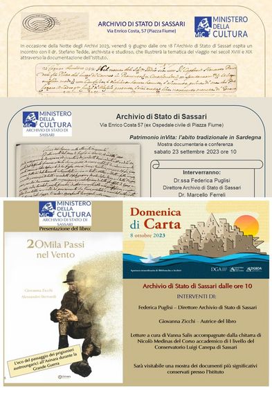 L'Archivio di Stato di Sassari, facente parte della Rete degli Archivi Sardi promossa dalla Soprintendenza Archivistica della Sardegna, ha partecipato all’evento Notte degli Archivi del 9 giugno 2023 nell'ambito del festival nazionale Archivissima. Considerato che il tema proposto era #Carnet de voyage, è stato organizzato un incontro con il dr. Stefano Tedde, archivista e studioso, che ha illustrato la tematica del viaggio attraverso la documentazione conservata presso l’Istituto, in particolare gli atti notarili. L’itinerario ha ripercorso le testimonianze di viaggiatori giunti al porto di Alghero a metà del Settecento, viaggiando attraverso l’Europa al seguito di due gemelle siamesi, giungendo in Australia al seguito di Carlo Cossu, viceconsole a Melbourne nato in provincia di Sassari, per poi tornare nella Sardegna di fine Ottocento dove, dopo non poche difficoltà, fu costruita la ferrovia per collegare i centri principali dell’Isola. La serata è stata accompagnata dall’esibizione d’arpa di Fausta Zhang, Chiara Pistidda ed Eleonora Spanu, alunne del Conservatorio di Musica di Sassari, Classe di arpa della Prof ssa Paloma Tironi. All’evento in presenza, di cui immagini e video sono disponibili sulla pagina Facebook dell'Archivio di Stato di Sassari, hanno partecipato 23 spettatori; è possibile rivedere l'intervento del dr. Stefano Tedde attraverso il canale You Tube dell’Istituto.